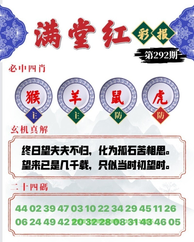 292期满堂红彩报:终日望夫夫不归,化为孤石苦相思。望来已是几千载,只似当时初望时。 六肖:龙蛇虎牛鸡兔 三肖:龙蛇虎 一肖:龙 特码:02.26.25.37.04.16.17.41.09.21.03.39 |