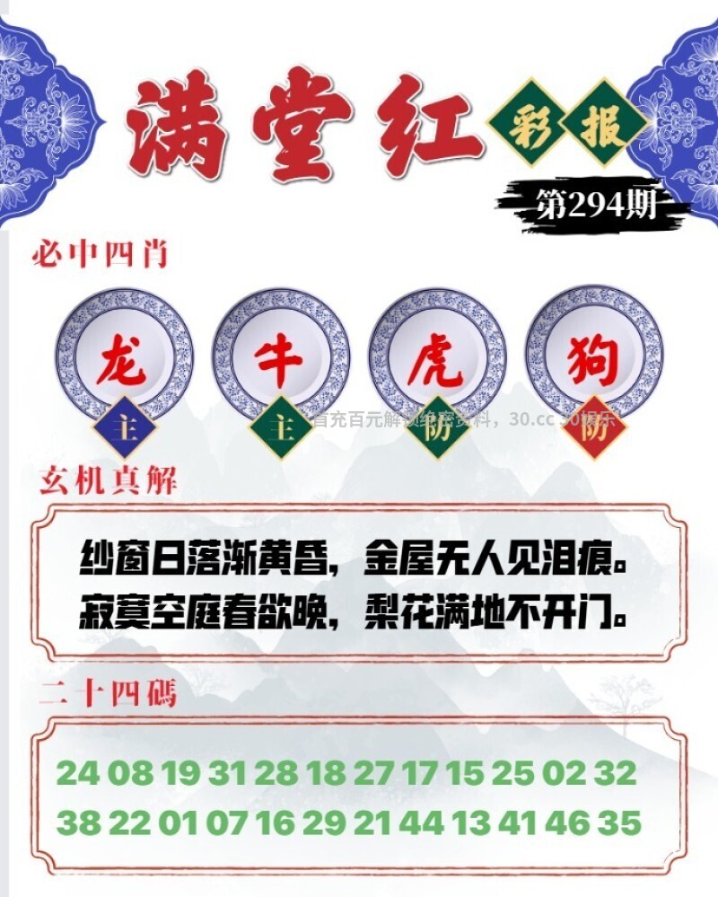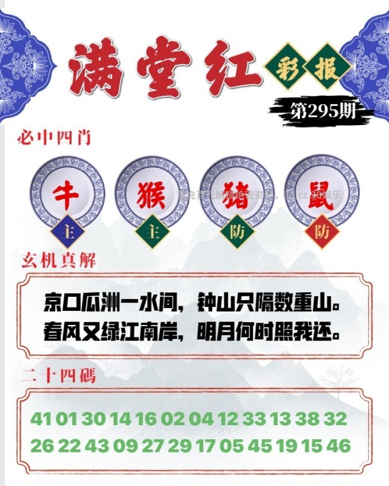 295期满堂红彩报:京口瓜洲一水间,钟山只隔数重山。春风又绿江南岸,明月何时照我还。 六肖:牛马猴虎蛇鸡 三肖:牛马猴 一肖:牛 |